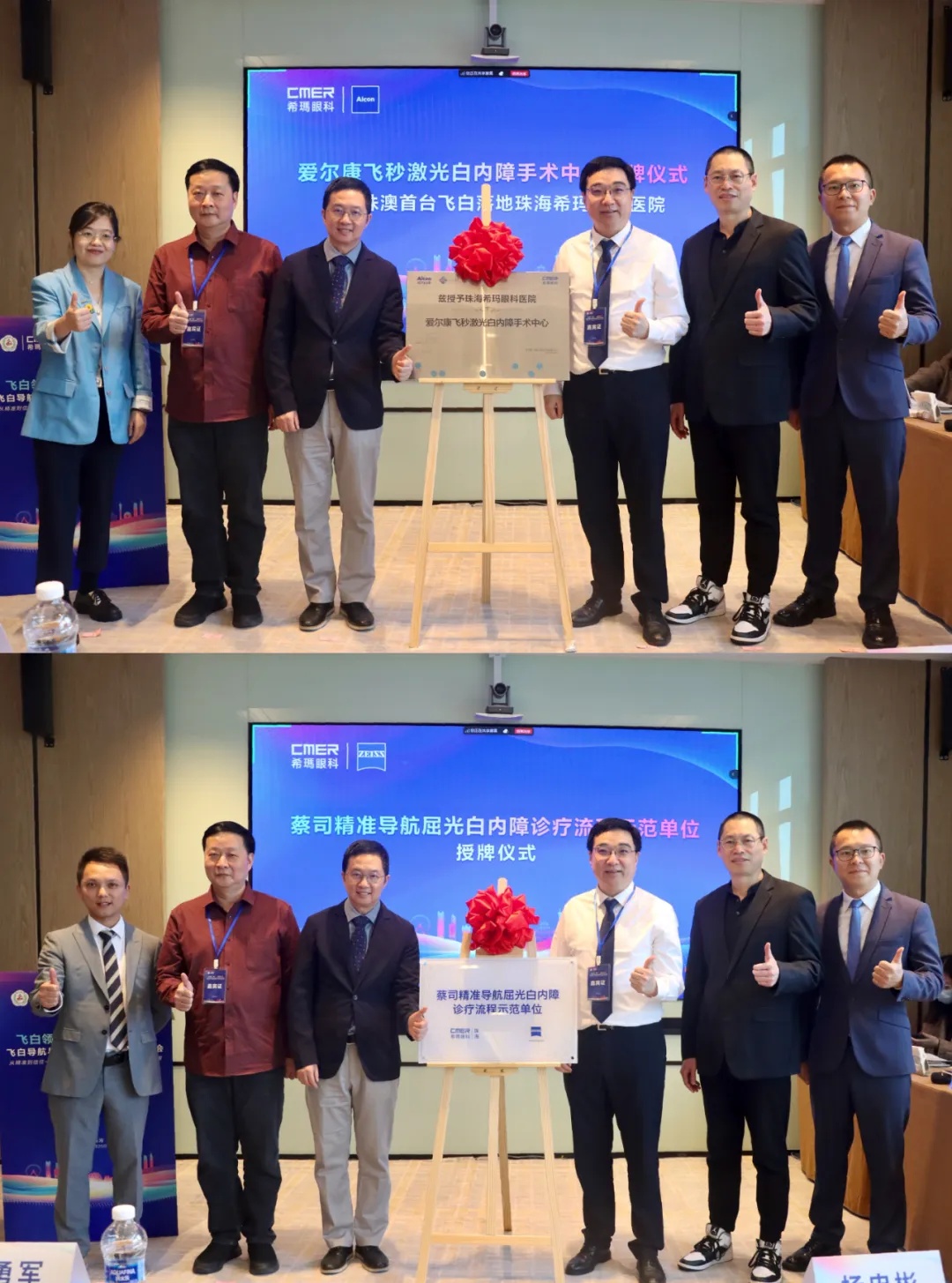 学术研讨会正式开始前,由香港希玛眼科集团支持,珠海希玛眼科医院、爱尔康公司、蔡司公司联合主办的“爱尔康飞秒激光白内障手术中心授牌暨珠澳首台飞白落地仪式”、“蔡司精准导航屈光白内障诊疗流程示范单位授牌仪式”先后举行,这两项授牌不仅是行业对珠海希玛眼科屈光白内障诊疗技术实力与服务水平的高度认可,更标志着珠海希玛眼科正式成为珠澳地区首家掌握“飞秒激光白内障 + 精准导航”双技术支撑的眼科机构,将为本地及周边患者提供高端屈光白内障、老花矫视手术解决方案。