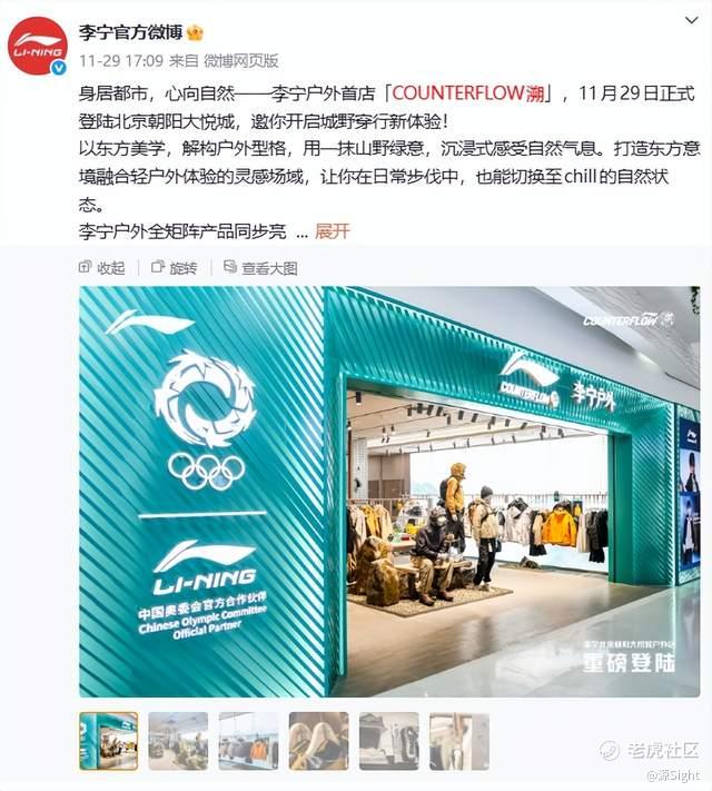 11月底,李宁在北京朝阳大悦城开出户外首店“COUNTERFLOW溯”。该线下空间集零售、体验与社群互动于一体,产品主要面向都市户外人群。作为“单品牌、多品类”战略的最新延伸,李宁户外是其调整后进攻的重要一步。