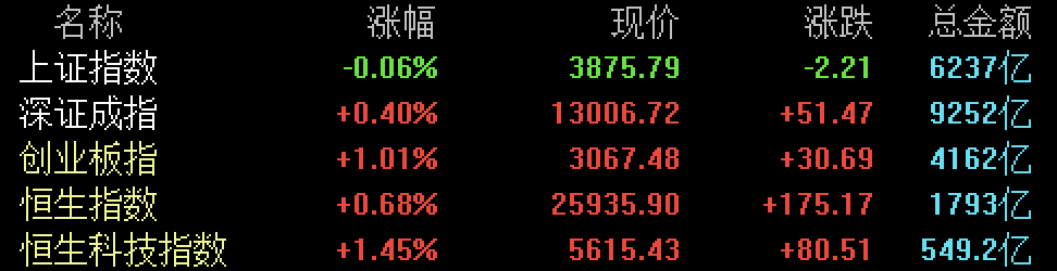今天A股三大指数涨跌不一,上证微跌,创业板则涨超1%,两市个股依然跌多涨少,超3500家个股下跌,仅1000多家上涨。港股的走势要好一些,尾盘有冲高,恒生科技指数涨超1%,不过港股也在缩量,全天量能已不足2000亿港元。