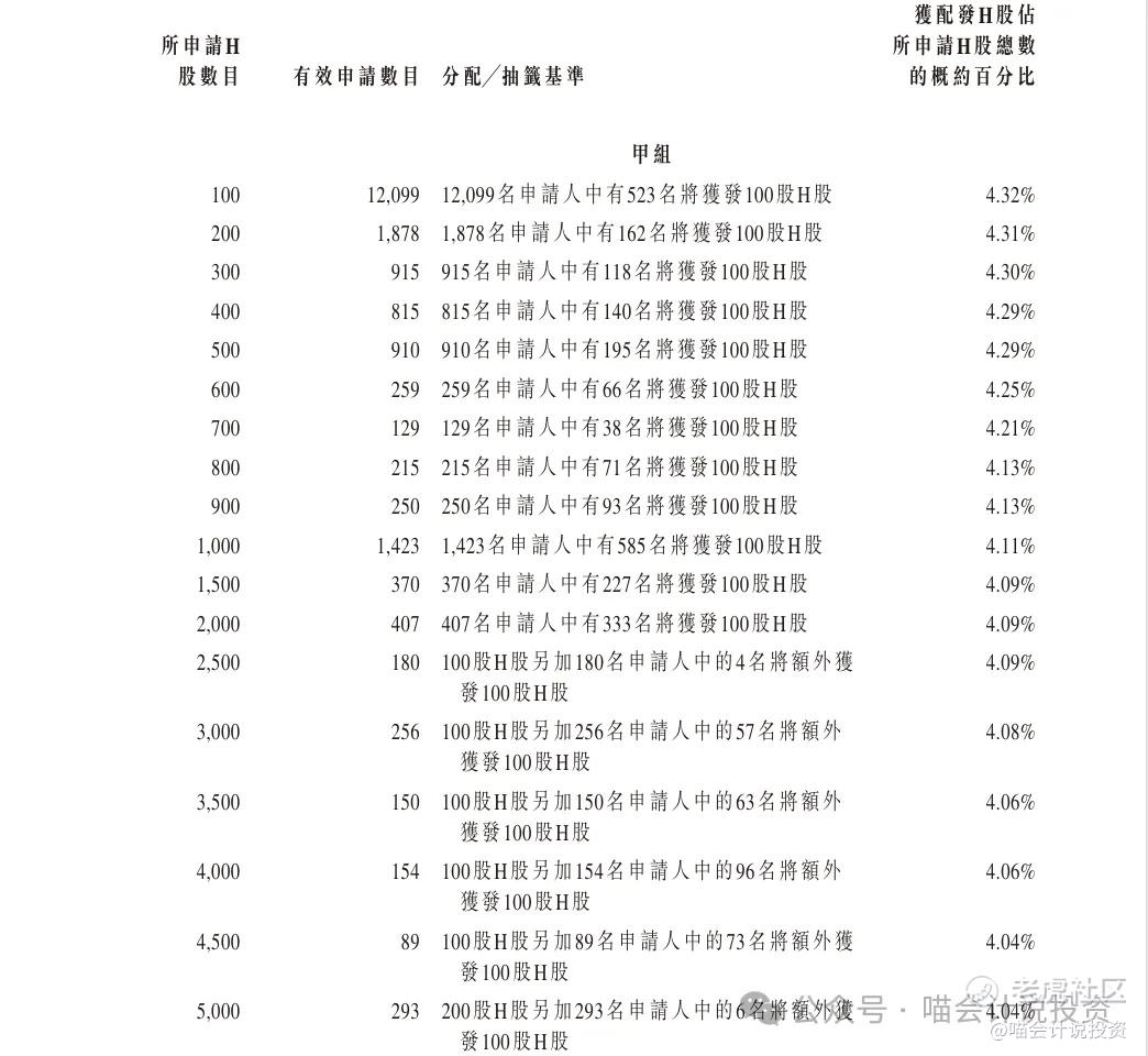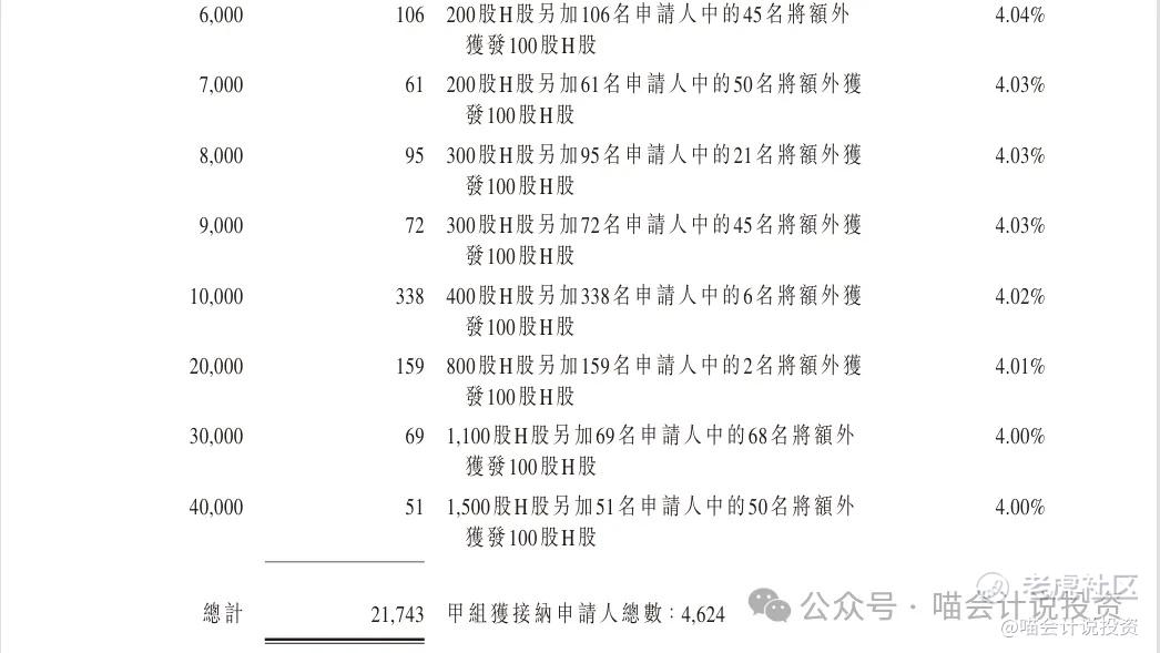 甲组分配:近大通铺,甲尾单手中签率4.00%,400手中签15.98手;