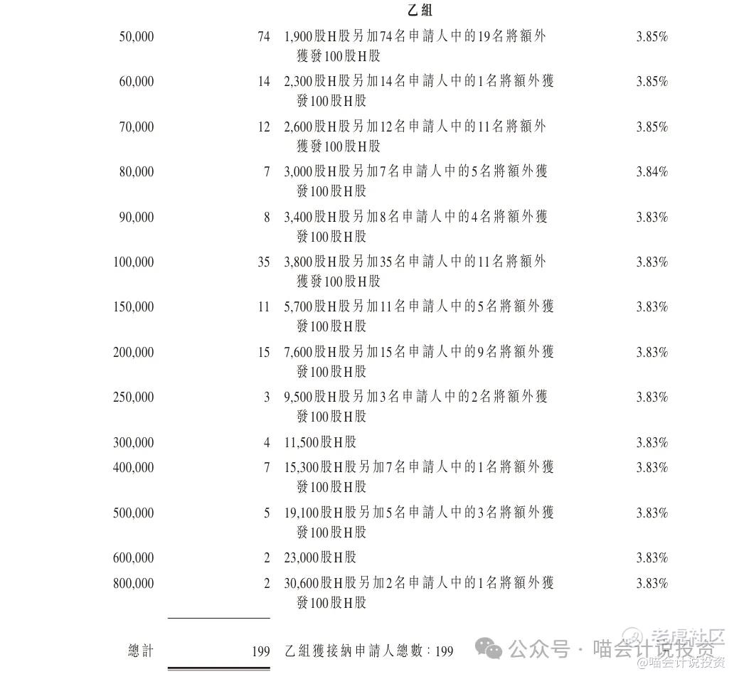 乙组分配:大通铺,乙头单手中签率3.85%,500手中签19.26手;