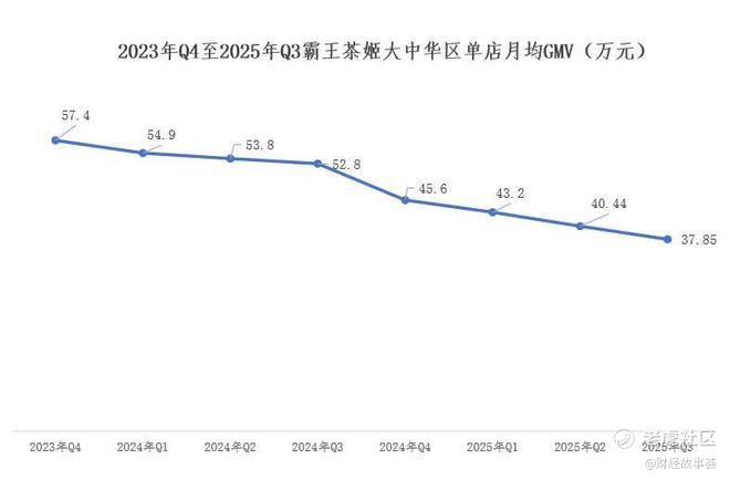 张磊的门店并非个案。据霸王茶姬财报显示,大中华区单店月均GMV从2023年Q4的57.4万元,连续7个季度下滑至2025年Q3的37.85万元。