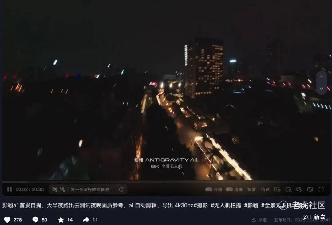 在抖音等平台,有首销用户发布了影翎Antigravity A1无人机拍摄的作品,认为产品的夜晚画质很一般,防抖也不及预期,这些都有待改善。