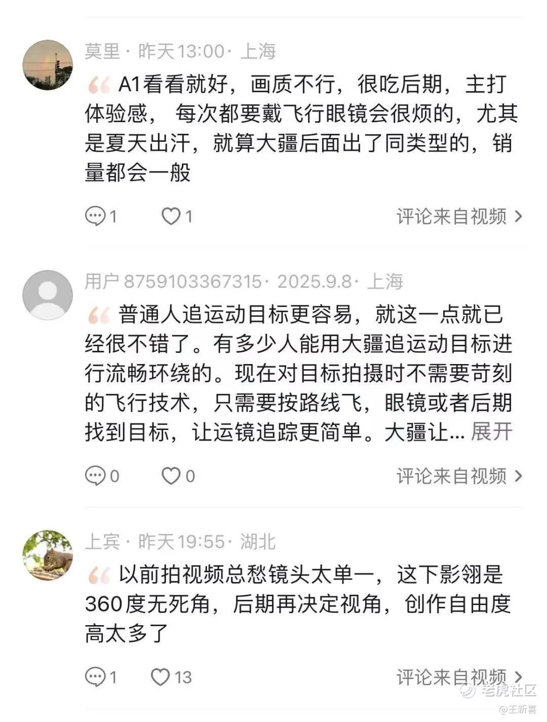 在小红书,一个叫超超数码的博主认为该产品的定位存在问题:要是对标专业的航拍生产力工具,但现阶段图传和画质细节还不够详实,很难满足专业创作者的刚需,要是主攻飞行娱乐市场,设备的眩晕问题又可能劝退不少玩家。