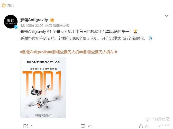 在12月5日23点,影翎官方微博官宣,Antigravity A1 全景无人机上市首日包揽多平台单品销售第一!