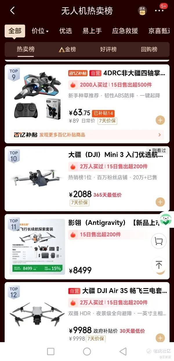 而从天猫与京东无人机榜单来看,这两个电商平台前三都是大疆包揽,影翎A1都没有进入前十。