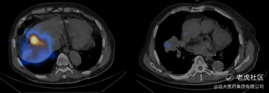 (左:图5 SIRT后肝扫描(48h);右:图6 SIRT后肺扫描(48h))