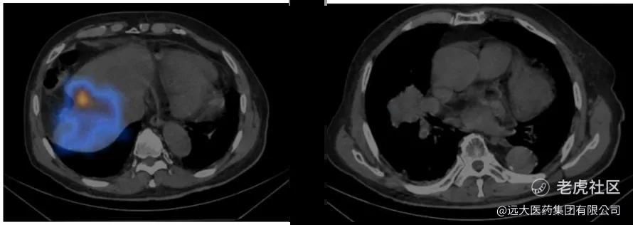 (左:图3 SIRT后肝扫描(24h);右:图4 SIRT后肺扫描(24h))
