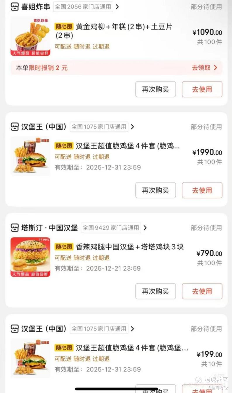 此次BUG于12月7日晚在社交平台和羊毛群快速扩散,一时间大量“羊毛党”闻风而动,纷纷大批量下单,100个汉堡王脆鸡堡、100个喜姐炸串套餐、100杯库迪美式咖啡等订单被网友在社交媒体上晒出。