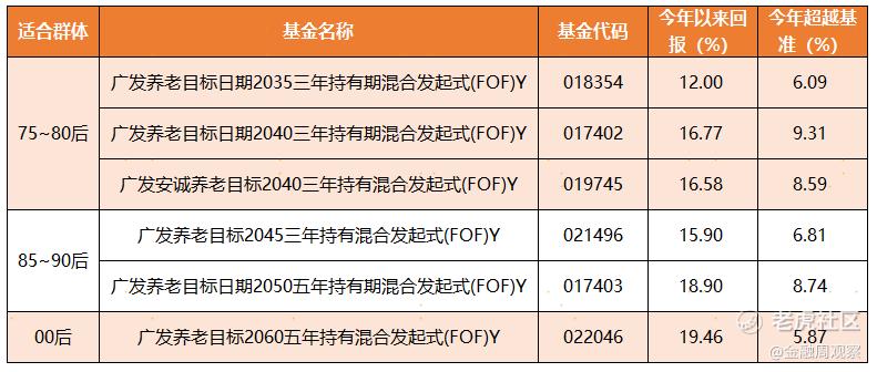包括这只产品在内,广发旗下共有6只目标日期FOF,涵盖退休时间在2035~2060年区间的人群需求,也就是70后~00后群体,大家可以对号入座,选择适合自己的产品即可。