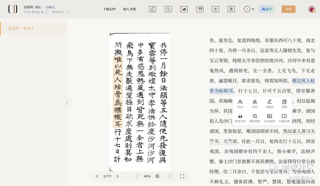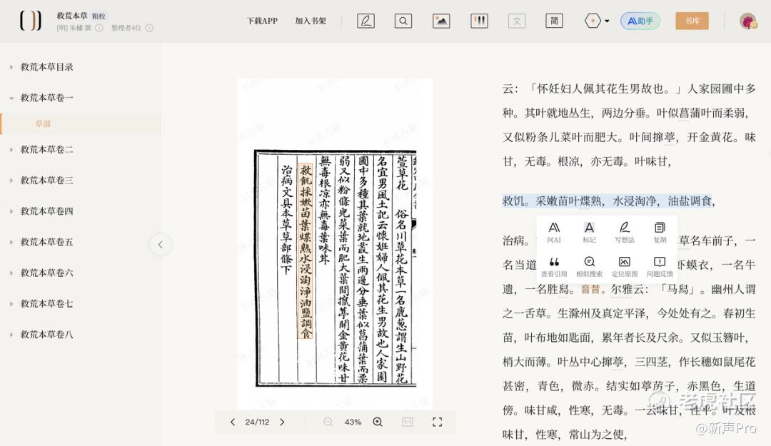 得益于技术的发展,今天我们不需要亲自去图书馆查阅翻看古籍,就能很快看到他们的王者「神迹」。「识典古籍」是字节跳动联合北京大学共同打造的公益性古籍数字化平台,有网页也有APP,可阅读40000余部古籍,并包含全文检索、可溯源引文、跨书聚合、AI分析等功能。并且打开「识典古籍」找到「深度研究助手」功能,它就会帮你整理一篇严谨丰富的学术报告。