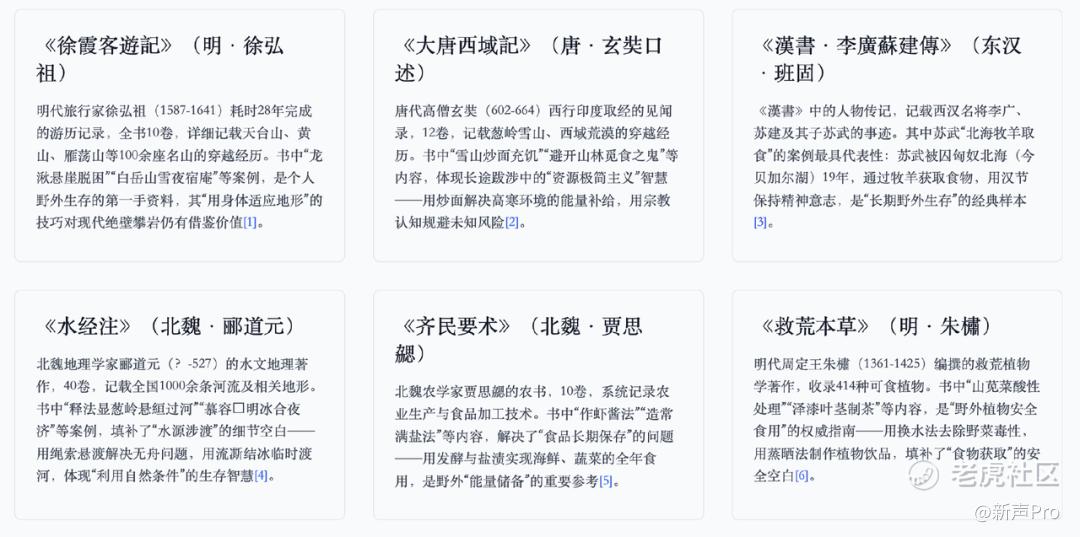如果想研究实用的技术,「深度研究助手」还可以总结古籍里所有荒野求生的方法,并归纳分类,形成一部技术宝典。