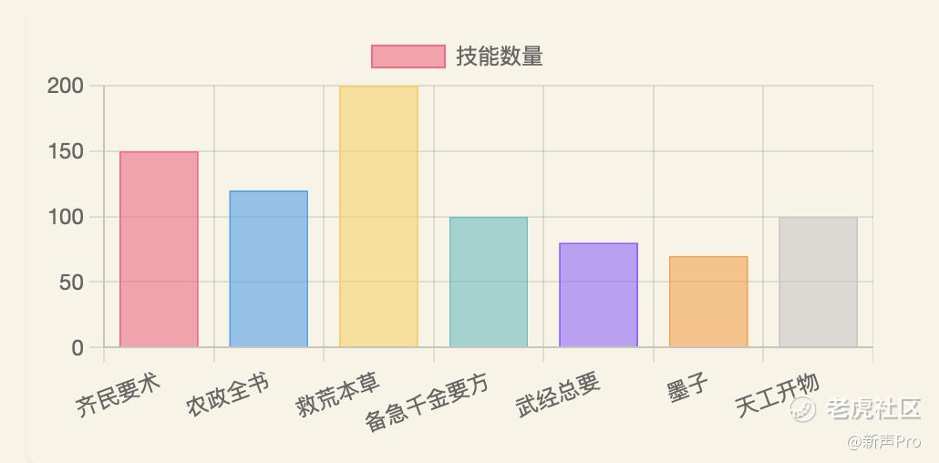 总结来说,《救荒本草》贡献200条技能(24%),是当之无愧的「救荒第一书」——其以「救饥」为核心,收录了414种野生植物的识别与食用方法;《齐民要术》(150条)次之,作为「农书」覆盖了食物的种植与储藏。