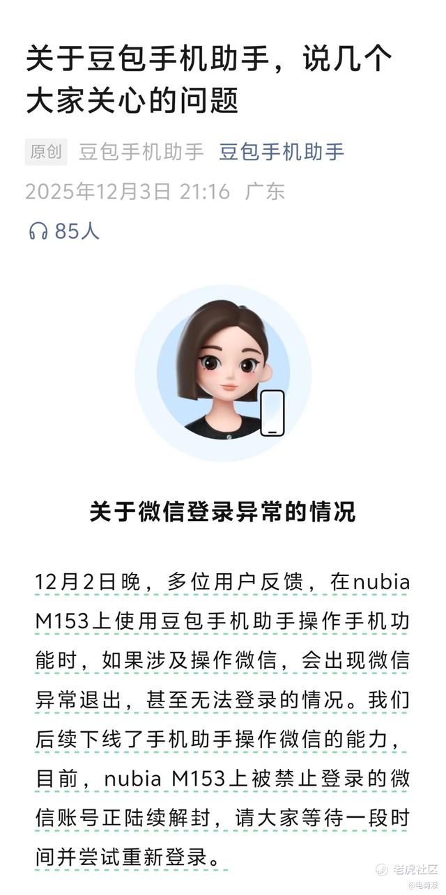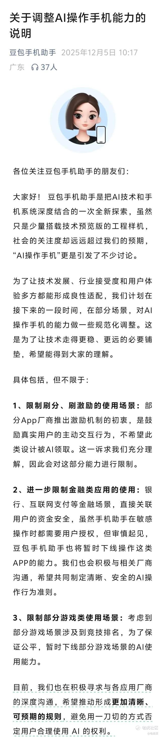 在12月5日,豆包团队发布的《关于调整AI操作手机能力的说明》中已表示将暂停对金融类APP的操作,并限制部分游戏场景的辅助能力。