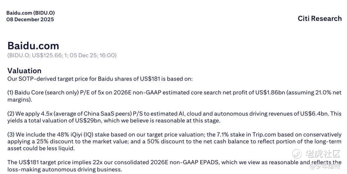 ③其他权益资产与现金折扣:爱奇艺(IQ)48%股权按照 IQ目标价进行估值;携程(Trip.com)7.1%股权,在市值基础上打 75 折估算;对净现金余额打5折,理由是长期资产流动性相对较差。2026 年合并口径非 GAAP 每股收益(EPADS)约 22 倍市盈率,对应的 181 美元目标价。