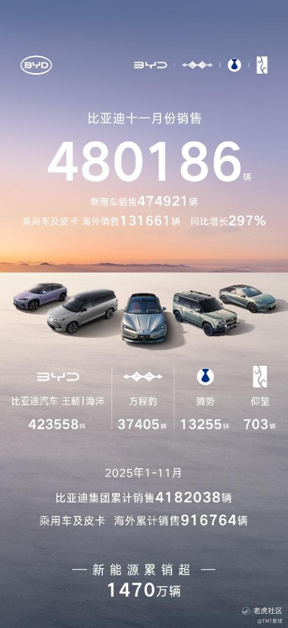 2025年11月,比亚迪销售超48万辆,其中海外销售突破13万辆,双双创年内新高。2025年1-11月,比亚迪累计销售已超418万辆,持续领跑全球新能源汽车市场,完成全年460万销量目标也是板上钉钉的事了。
