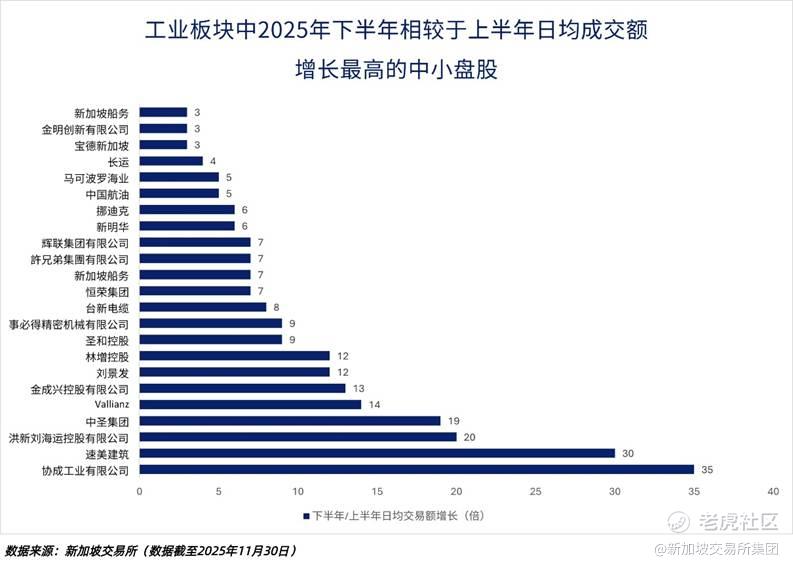 在属于新交所工业板块分类的中小盘股票里,协成工业有限公司(Hiap Seng Industries)、速美建筑(Soilbuild Construction)与洪新刘海运控股有限公司(ASL Marine)在2025年下半年相较上半年录得最强劲的成交额增长。