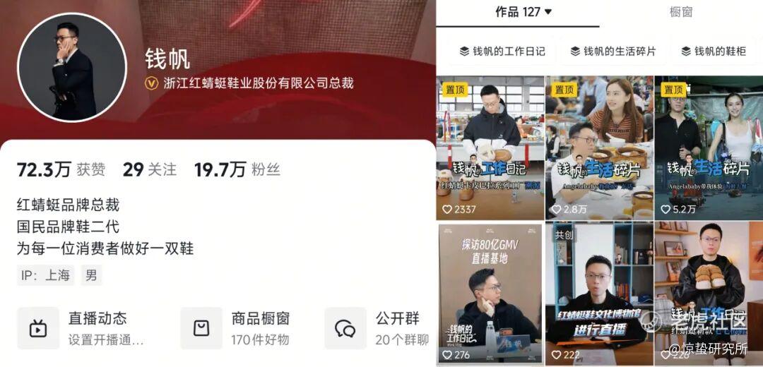 惊蛰研究所注意到,红蜻蜓总裁钱帆的个人抖音账号从2024年7月开始更新短视频作品,通过持续发布“钱帆的工作日记”“钱帆的生活碎片”等特色内容,钱帆个人账号粉丝量已达19.7万。