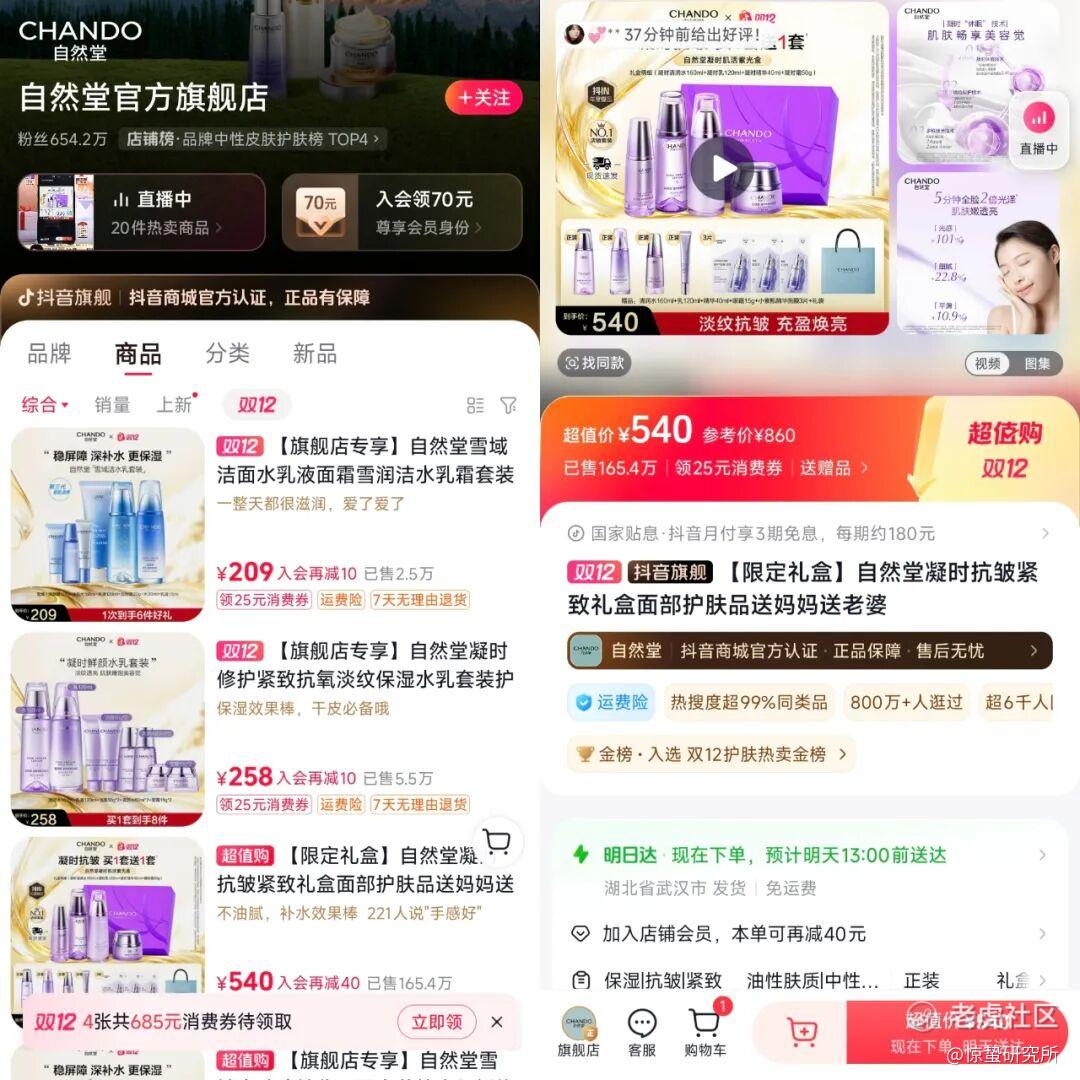 打开自然堂的抖音直播间不难发现,整体货盘中有相当大的一部分是套盒产品。这是因为套盒产品迎合了直播电商用户“一站式”与“超值感”的购物需求。