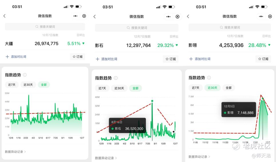 主编引用的微信指数里,影石关键词近30天日均指数为“5M”(500万缩写),而大疆的日均指数为“25M”(2500万),也就说正常的时段下,大疆热度是影石的五倍左右,这也符合市场的真实情况。