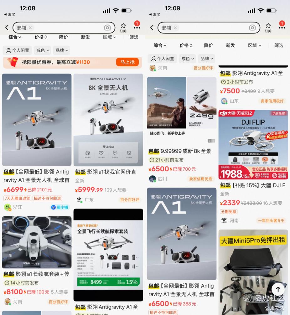 闲鱼上有关影翎Antigravity A1的销售帖已有一百多篇,某款全新未拆封的标准套餐,已有商家喊出6499元价格,比原价6799元便宜了300元。从闲鱼上观看,有的最高降了2千元,普遍的都以低于原价几百元区间对外售卖。