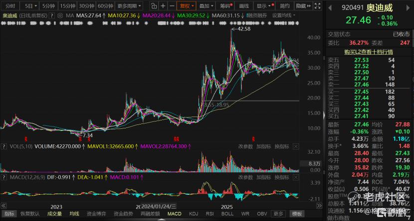 奥迪威曾于2015年5月在新三板挂牌,2022年6月摘牌,并在北交所上市,股票代码:920491,截至2025年12月4日收盘,公司股价27.46元/股,市值38.76亿元。