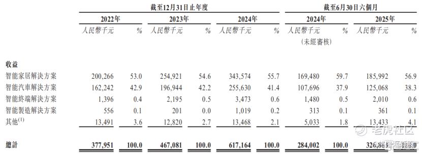 按下游应用场景来划分,智能家居解决方案是公司的主要收入来源,2025年上半年收入占比约56.9%;其次是智能汽车解决方案,2025年上半年收入占比约38.3%;来自智能终端解决方案及智能制造解决方案的收入占比不足1%。