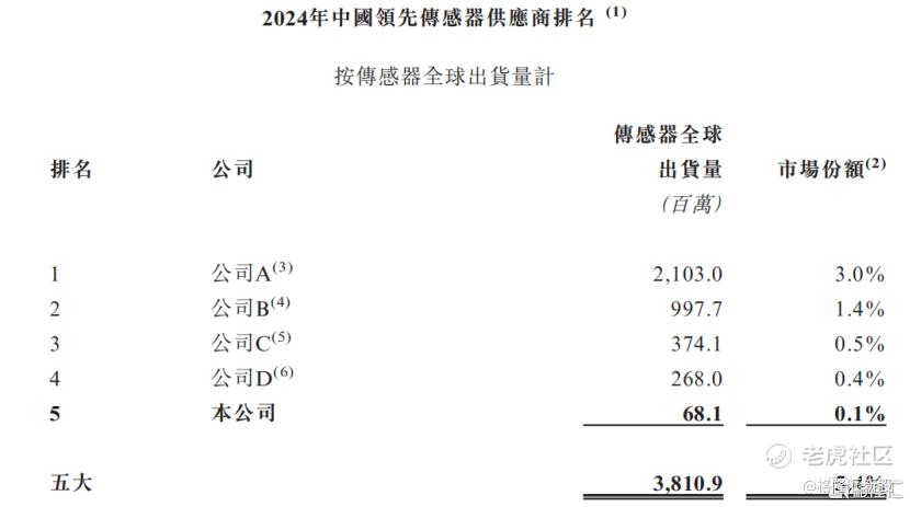 就全球传感器出货量而言,公司于2024年在中国排名第五;