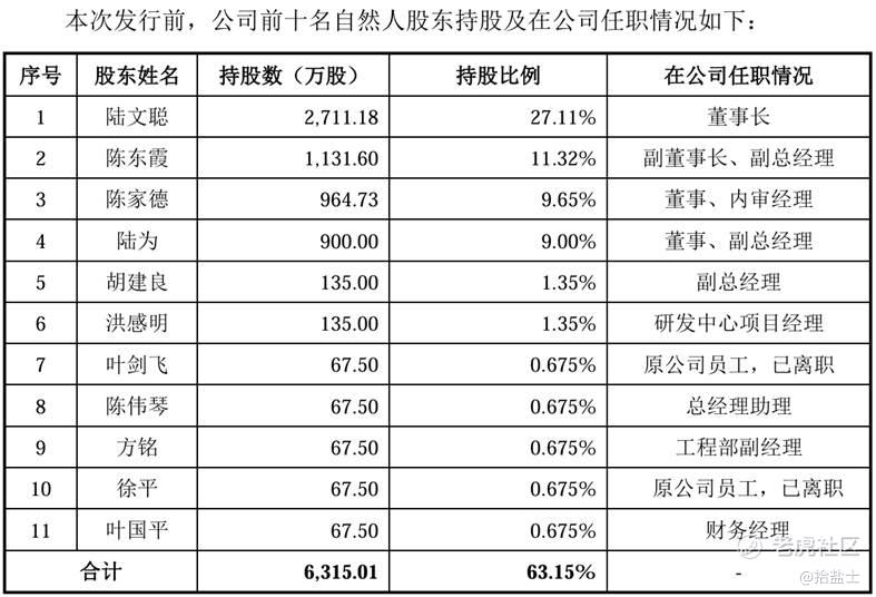 截至申报前,陆文聪父女合计掌控36.11%股权,加上副董事长陈东霞、董事陈家德等早期核心成员的持股,管理层合计持股超57%,前十大自然人股东均为公司高管或员工。