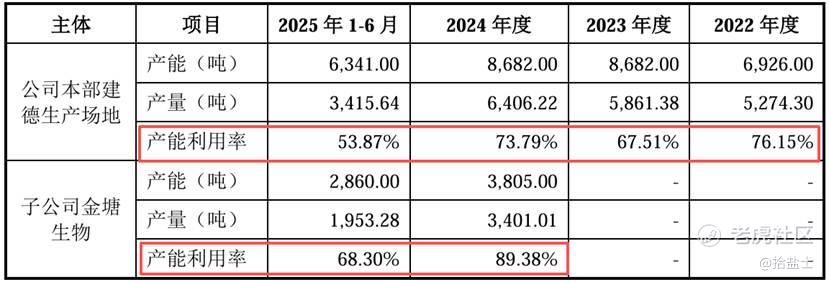 2022年到2025年上半年,公司本部的产能利用率分别为76.15%、67.51%、73.79%和53.87%,整体呈现走低的趋势。子公司金塘生物的产能利用率也已经降至68.30%。在当前产能尚未得到充分消化的情况下,格林生物却仍计划募集资金4.2亿元投入年产6300吨高级香料生产项目,新增全合成系列和松节油系列产品产能。