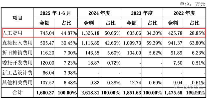 其研发投入的结构也颇为耐人寻味。2022年、2023年,格林生物研发投入中的人工费用占比均在30%左右,到了2024年人工费用同比暴涨109%至1326万元,占比过半,而直接投入费用仅增长1.56%。2025年上半年,其人工费用就已经超过了2023年人工费用的总和。