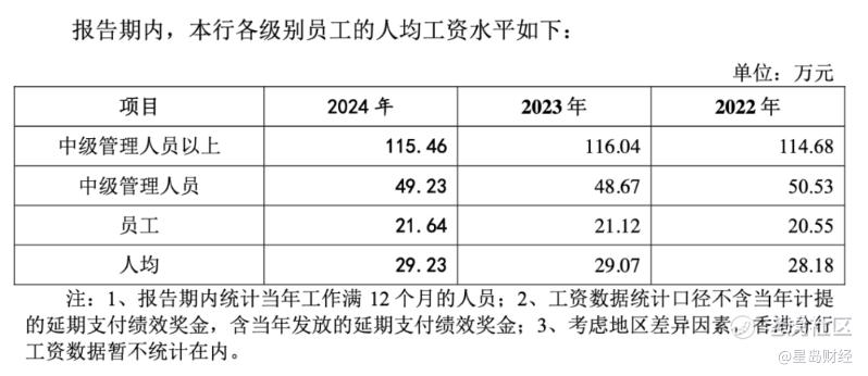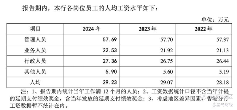 事实上,人均29.21万元的年薪水平在金融行业内并不算太高,这一数据与东莞银行今年6月更新的招股说明书中提到的29.23万元/年员工人均薪酬相比差距也不算大。2022年和2023年,该行员工人均年薪分别为28.18万元、29.07万元。