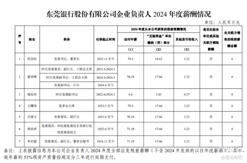 除披露了职工平均工资外,东莞银行也在官网公示了7名企业负责人2024年的薪酬情况。