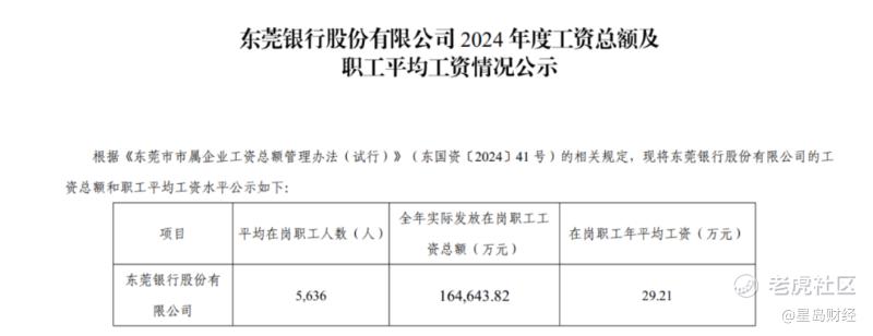 近期,东莞银行通过官网披露了2024年度工资总额及职工平均工资情况。据其公告,2024年,东莞银行平均在岗职工人数5636人,全年实际发放在岗职工工资总额16.46亿元,在岗职工年平均工资29.21万元。
