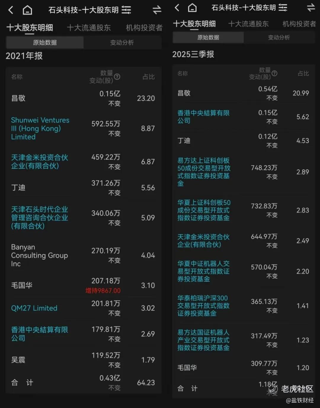 2021年年报显示,Shunwei(顺为)、天津金米、天津石头时代、启明分别持有石头科技8.87%、6.87%、3.02%的股份。而截至2025年三季度,天津金米的持股比例下降到2.49%,顺为、天津石头时代、启明已经退出十大股东行列。