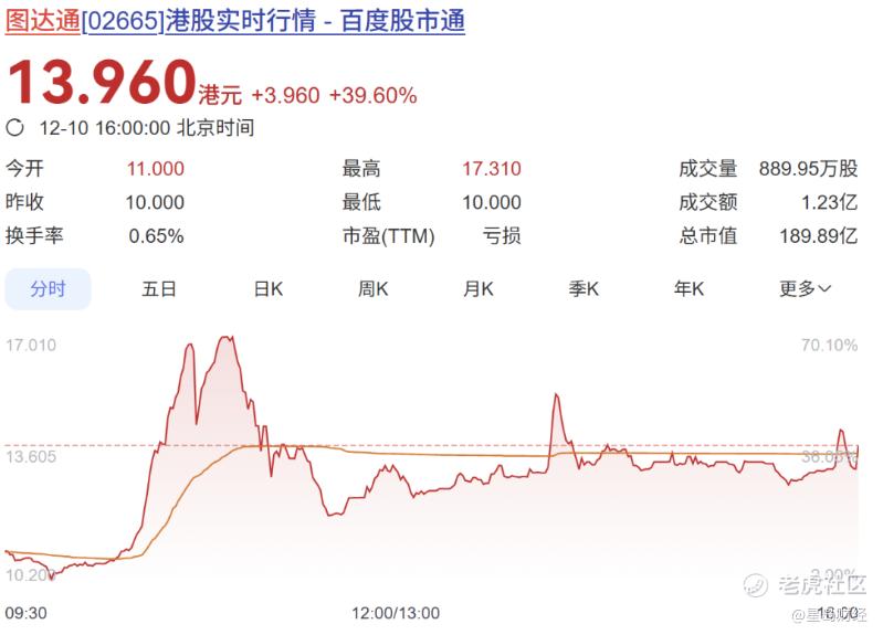 在正式挂牌当天,图达通股价上演“过山车”行情。在高开10%报11港元后,走势先抑后扬,上午11点左右一度暴涨73.10%至17.31港元,随后快速回落,截至收盘,涨幅收窄至39.60%,报13.96港元,总市值189.89亿港元。