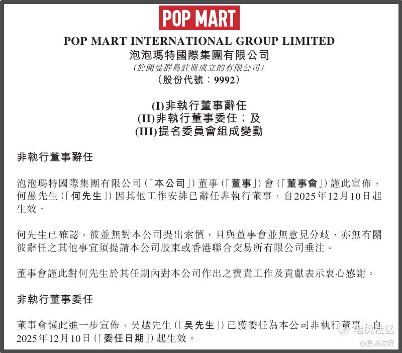 12月10日,泡泡玛特公告宣布董事会成员重大调整:原非执行董事何愚因个人工作安排辞任,即日起生效;同时,原LVMH集团大中华区总裁吴越正式获委任为公司新任非执行董事。