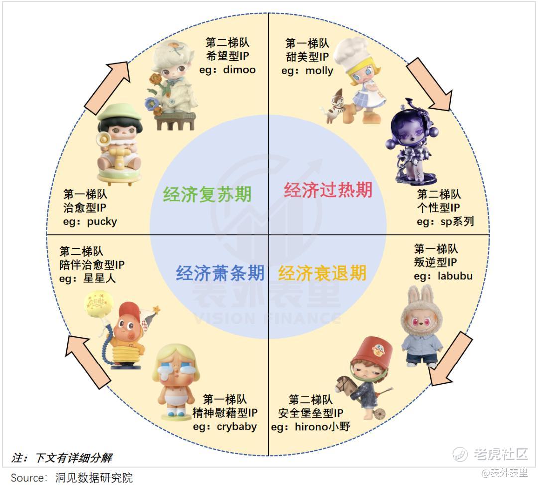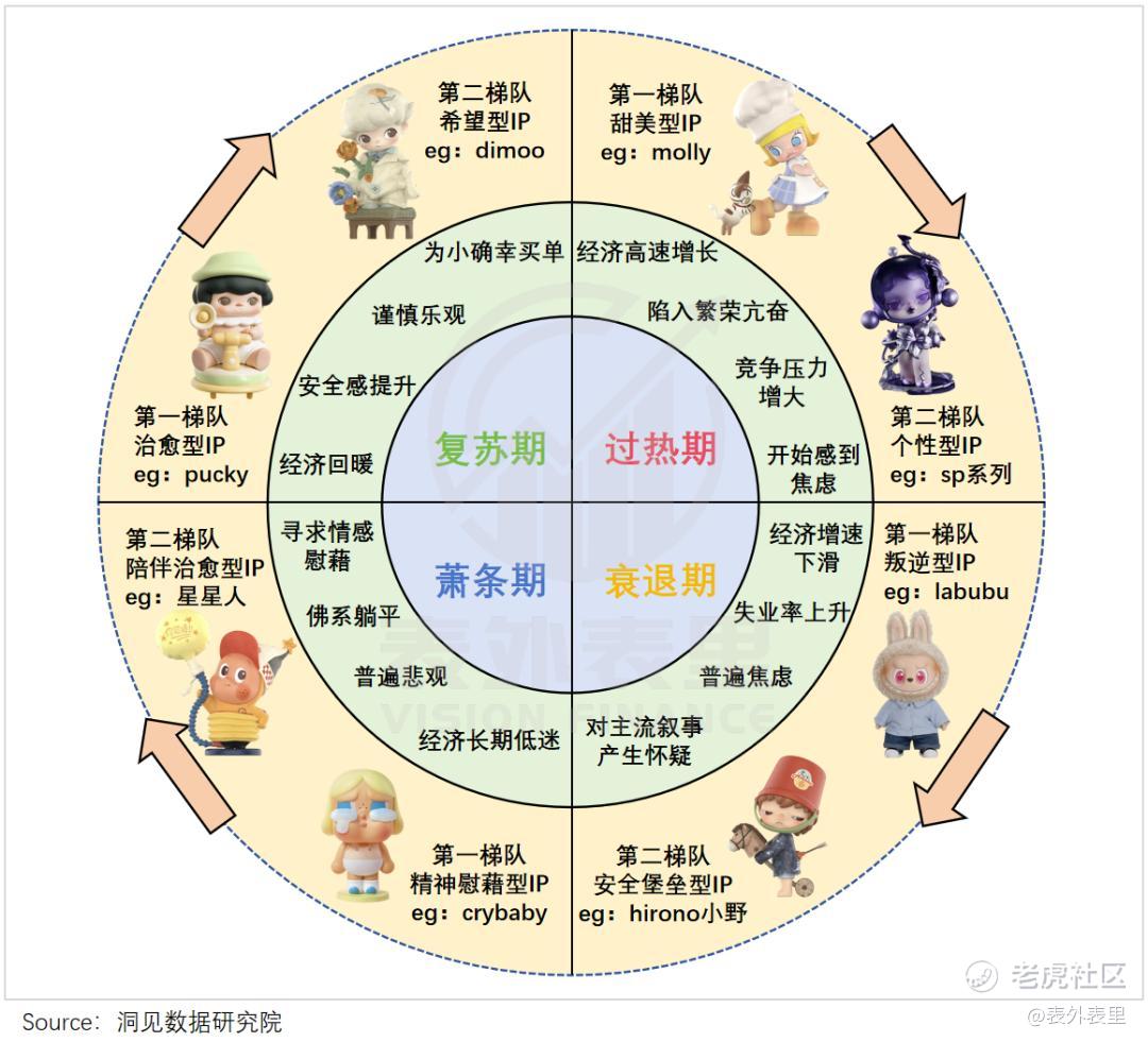引入经典投资模型“美林时钟”来看,情绪经济同样存在周期:经济向好,人们普遍乐观自信,寻求个性与表达,此时甜美系IP吃香;经济低迷期,焦虑广泛蔓延,宣泄情绪和慰藉心灵成了时代需求,暗黑系、治愈系IP崛起。