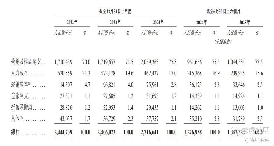 招股书披露,2024年销售及营销成本同比增长12.9%,高于收入3.6%的增幅。如果将销售及营销成本分来看,营销和推广开支在其中占比越来越高。2022年,营销及推广开支在销售及营销成本中的占比是70.0%;2023年是71.5%;到了2024年已经升到75.8%。截至2025年6月30日,这个占比继续升到77.5%。