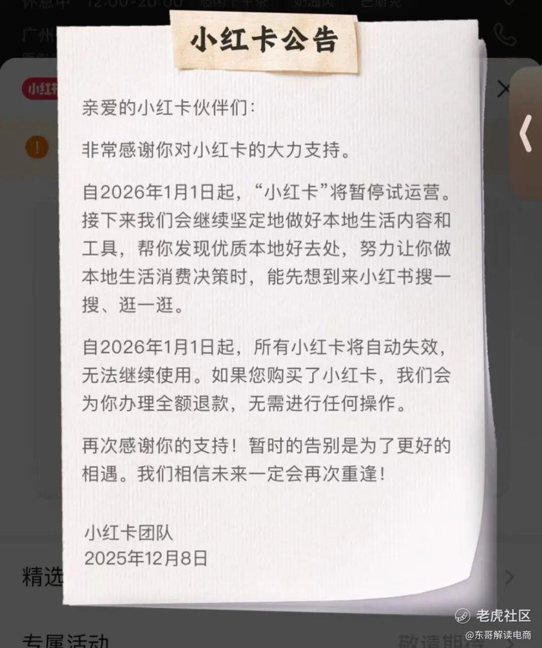近日,小红书官方团队发布公告,宣布本地生活会员产品“小红卡”将在2026年1月1日起暂停试运营,并为所有购卡用户办理全额退款。这份公告发出距离小红卡上线不足百日。