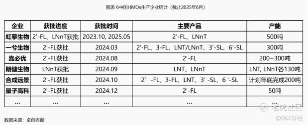 据卓创咨询统计,到2025年6月底,我国共有6家进口企业和6家本土企业的HMOs获得国家卫健委批准。目前,接近20种HMOs(多种母乳低聚糖的组合)产品获得国家卫生健康委员会批准为食品营养强化剂,我国已建设完成的母乳低聚糖产能超1500吨,在建产能在数千吨以上。