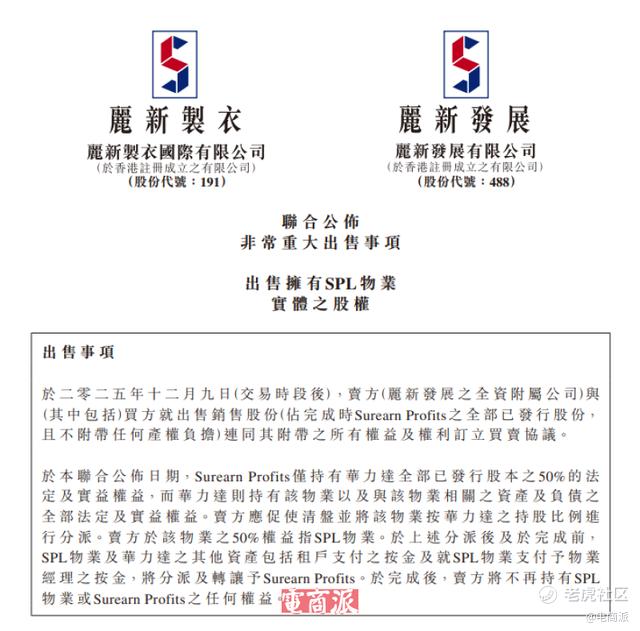 香港丽新发布公告称,公司旗下实际控制的主体TIL出售了其100%持股的Surearn Profits Limited的股权,上述股权对应的底层资产为位于香港中环的中国建设银行大厦部分办公楼层,面积约11202平方米(含公区摊销面积),收购方为京东控股的投资主体。本次交易还需获得相关审批。