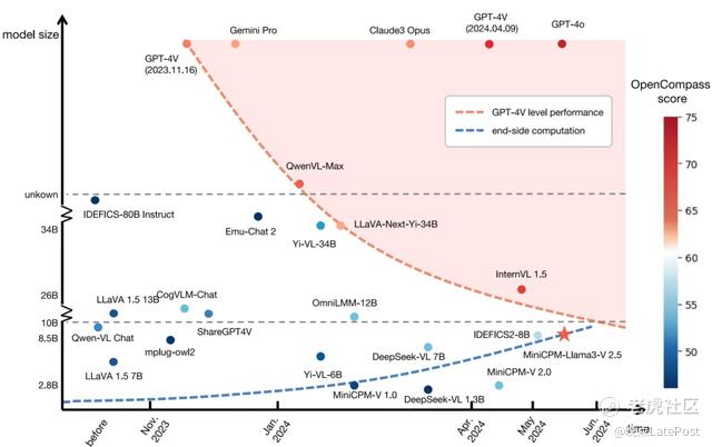 在《自然·机器学习子刊》的这篇论文之前,我们还有一篇发在《自然通讯》上的论文,是关于 MiniCPM-V(注:指论文 Efficient GPT-4V level multimodal large language model for deployment on edge devices),其中有张经典的图,就是描述密度法则结合硬件演进,能让端侧设备承载原来云端服务器上跑的模型才有的能力;具身智能团队最关心的就是,端侧的大脑什么时候可行。
