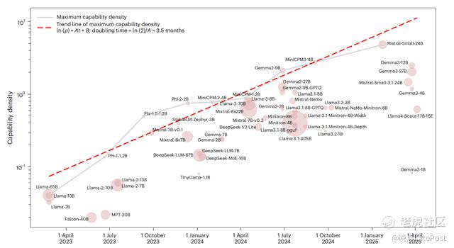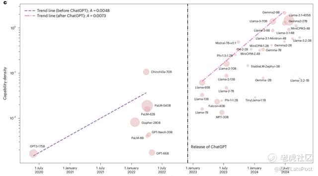 ChatGPT 出现之后(图中 2023 年 1 月的时间线),能力密度上升的斜率变陡。