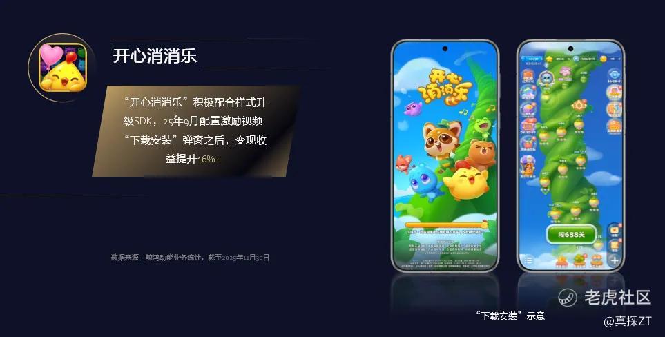 特别的是,平台通过“小游戏大联运”模式整合鲸鸿动能投放能力,提供 “买变一体”智能化工具,让开发者可以不断优化获客成本与变现 ROI。比如小游戏《打个螺丝》就通过优质素材、丰富多样的广告入口、高效的变现样式配合,投放消耗金额同比接入初期提升36%,变现eCPM同比接入初期提升40%。《欢喜斗地主》拥抱鸿蒙生态后,Q3 媒体收益增长超 100%,日活用户平均收益提升 80%。