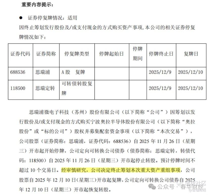 12月9日晚间,公司公告终止筹划收购宁波奥拉半导体股份有限公司(下称“奥拉股份”)86.12%股权的重大资产重组,称“实施条件尚未完全成熟”,双方无违约责任。公司股票于12月10日复牌,并承诺未来1个月内不再筹划重大资产重组。这场涉及AI、5G等核心领域的产业整合,最终因商誉风险、对价分歧与监管不确定性等多重因素未能推进。