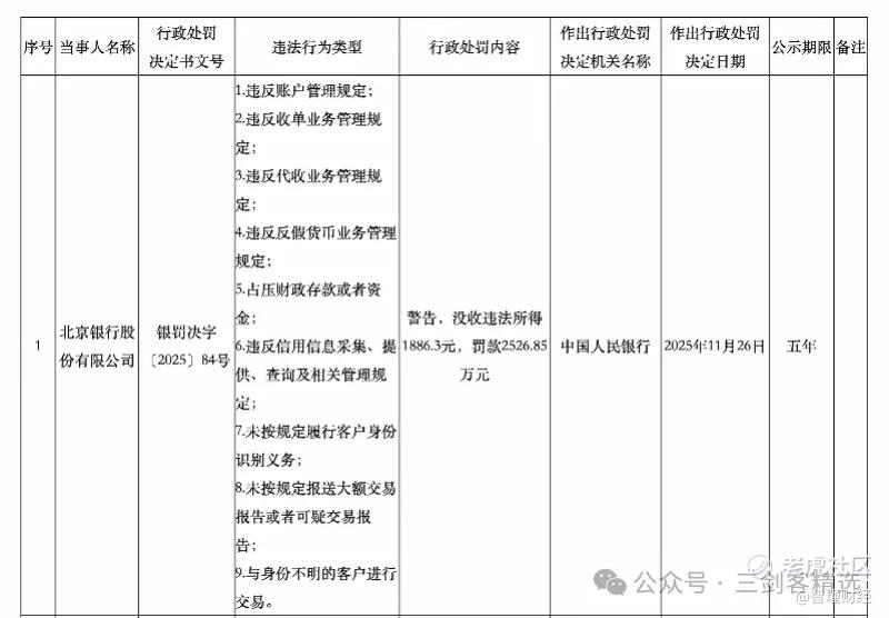 近年来,北京银行的合规问题犹如决堤之洪,一发不可收拾。2025年11月28日,中国人民银行的一纸罚单,将北京银行推上了风口浪尖——因九项严重违法行为,该行被警告并没收违法所得1886.3元,同时罚款高达2526.85万元。这一处罚力度之大,在城商行中极为罕见。更令人震惊的是,此次违规几乎覆盖了银行核心业务链条的每一个环节,从基础账户管理到支付结算,再到现金管理和核心风控领域,无一幸免。