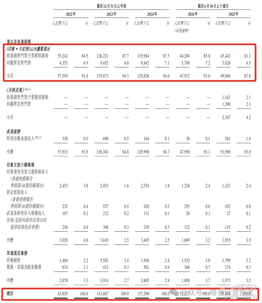 收入的绝对大头,还是严重依赖《印象·大红袍》的贡献,2025年新上的《月映武夷》还没起量,其他收入占比忽略不计了。喵老师如果中了签,吃到肉,一定去看一场《月映武夷》当做“爱的回馈”。