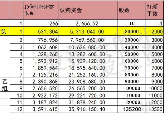 乙头需要认购资金532万,乙组的各档融资所需要的本金还有融资金额对应如下表: