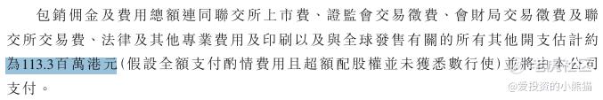 然后这个票招股书上按发售价263.00港元计算,公开的上市所有开支总额约为1.13亿港元,募资额约14.22亿港元,占比约7.97%,开支相比募资额算是一般化了。